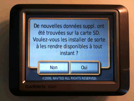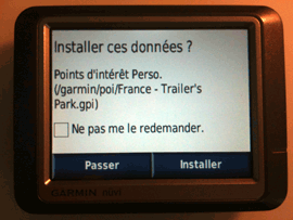 3/ Si vous avez appuyé sur le bouton 'Oui', Appuyez sur le bouton 'Installer' afin d'enregistrer les points GPS sur la mémoire interne. Attention : Si les points de la carte ne s'enregistrent pas sur votre GPS, c'est que vous n'avez pas assez de place. Veuillez en libérer en supprimant une partie de vos favoris.