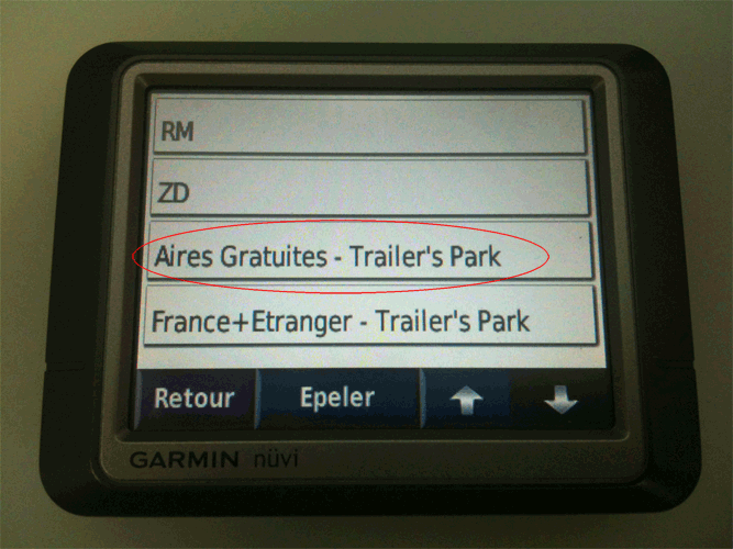 8/ Attention : tous les points de la SD ne sont pas affichés dans le listing ! Seuls les plus proches de votre position sont présents. Pour rechercher une aire, veuillez utiliser le bouton 'Epeler' ou 'Rechercher' selon le modèle du GPS.
